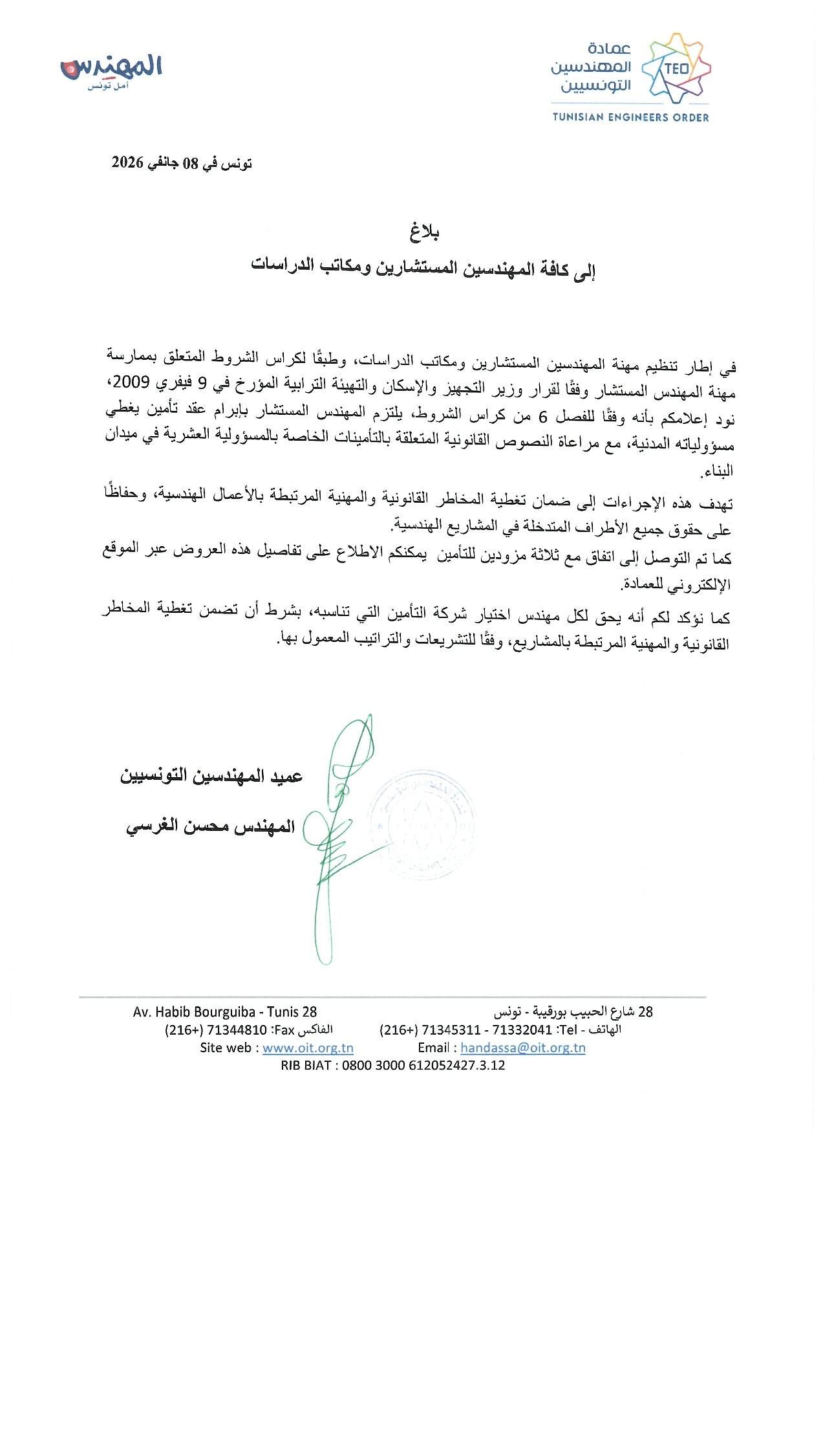 بلاغ إلى المهندسين المستشارين ومكاتب الدراسات بخصوص عقود التأمين
