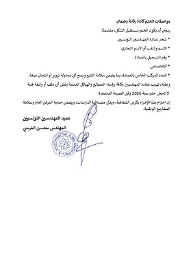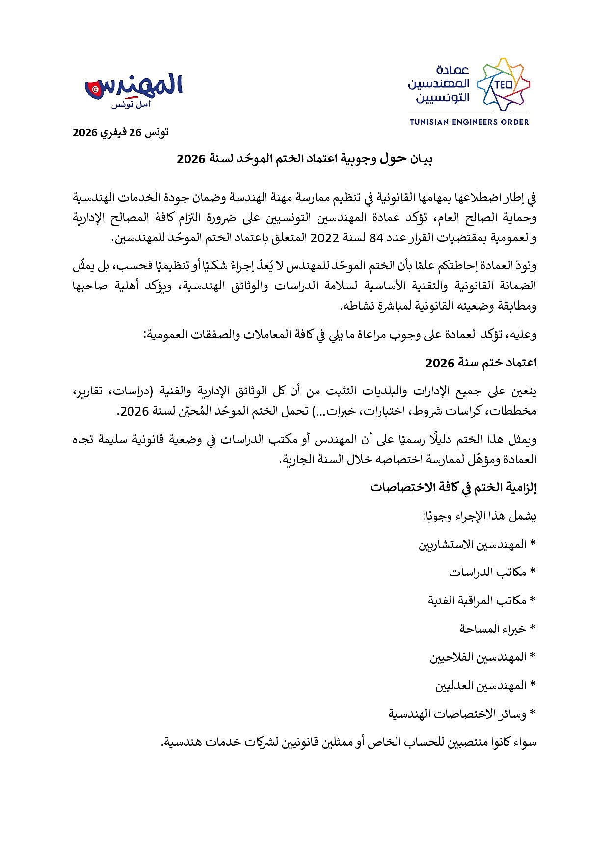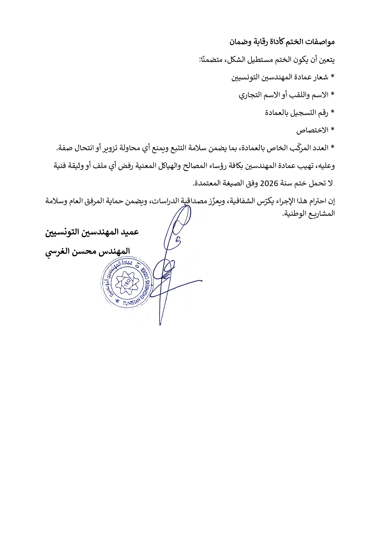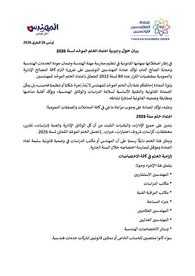 وتودّ العمادة إحاطتكم علمًا بأن الختم الموحّد للمهندس لا يُعدّ إجراءً شكليًا أو تنظيميًا فحسب، بل يمثّل الضمانة القانونية والتقنية الأساسية لسلامة الدراسات والوثائق الهندسية، ويؤكد أهلية صاحبها ومطابقة وضعيته القانونية لمباشرة نشاطه.