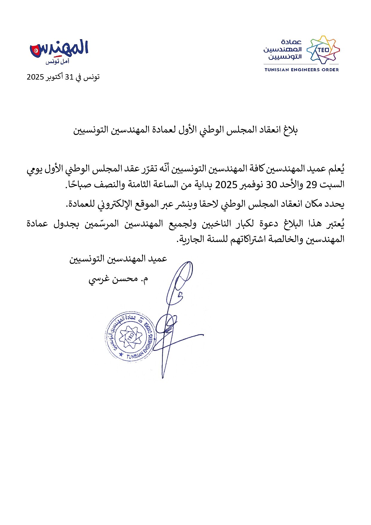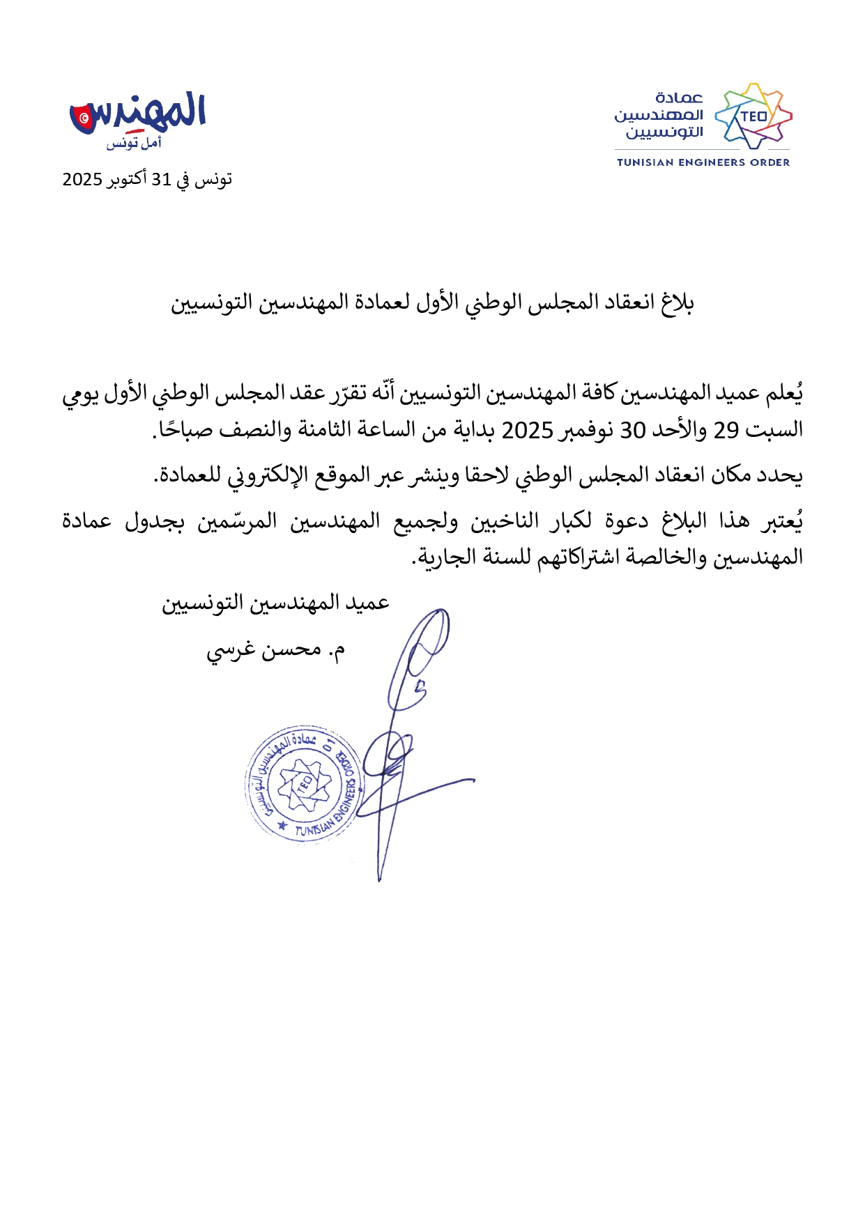 يُعلم عميد المهندسين كافة المهندسين التونسيين أنّه تقرّر عقد المجلس الوطني الأول يومي السبت 29 والأحد 30 نوفمبر 2025 بداية من الساعة الثامنة والنصف صباحًا.