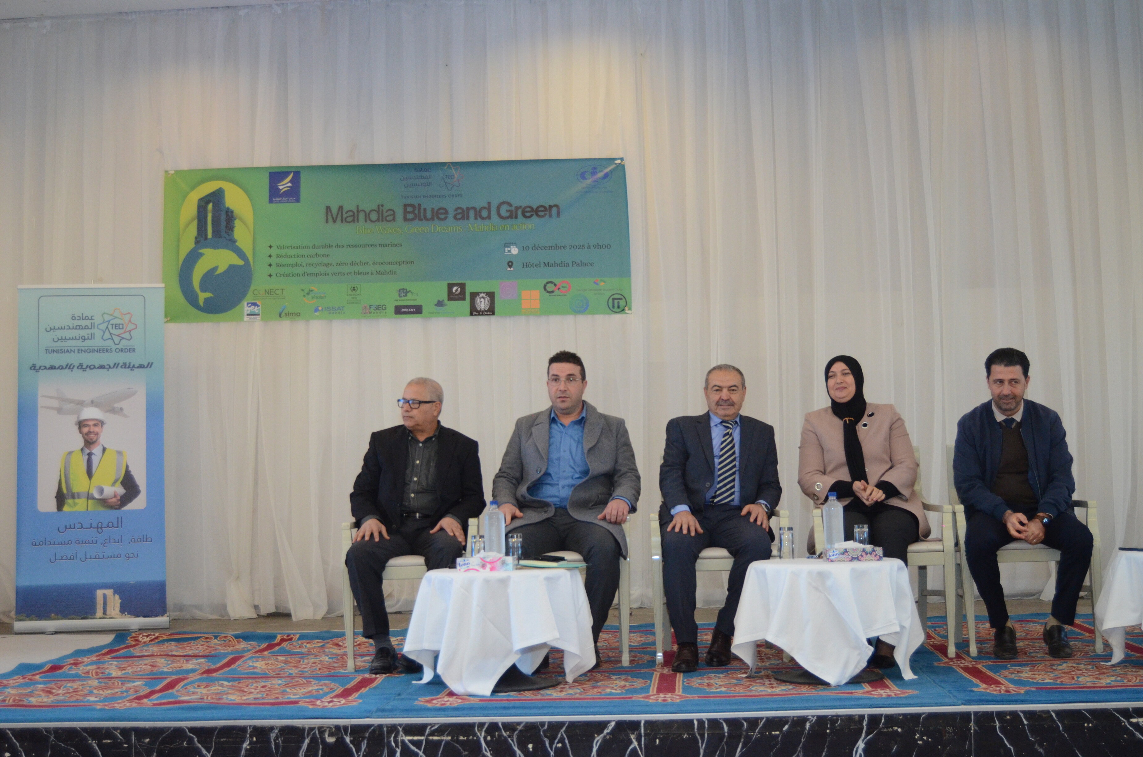 نظمت الهيئة الجهوية لعمادة المهندسين بالمهدية يوم الأربعاء، 10 ديسمبر 2025، يوم جهوي بعنوان : "المهدية – نحو إقتصاد أخضر أزرق ودائري" " Mahdia Blue & Green " وذلك تحت إشراف المهندس محسن الغرسي عميد المهندسين التونسيين والمهندس الحبيب العطاوي كاتب عام الهيئة الجهوية بالمهدية وبحضور السيدة معتمدة المهدية، والسيد الكاتب العام لبلدية المهدية، إضافة إلى عدد هام من الإطارات والمهندسين الشبان وممثّلي المؤسسات والفاعلين الاقتصاديين.