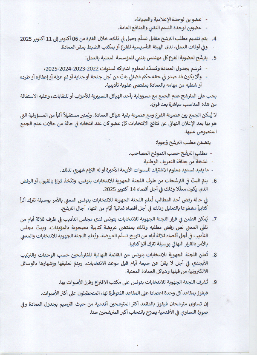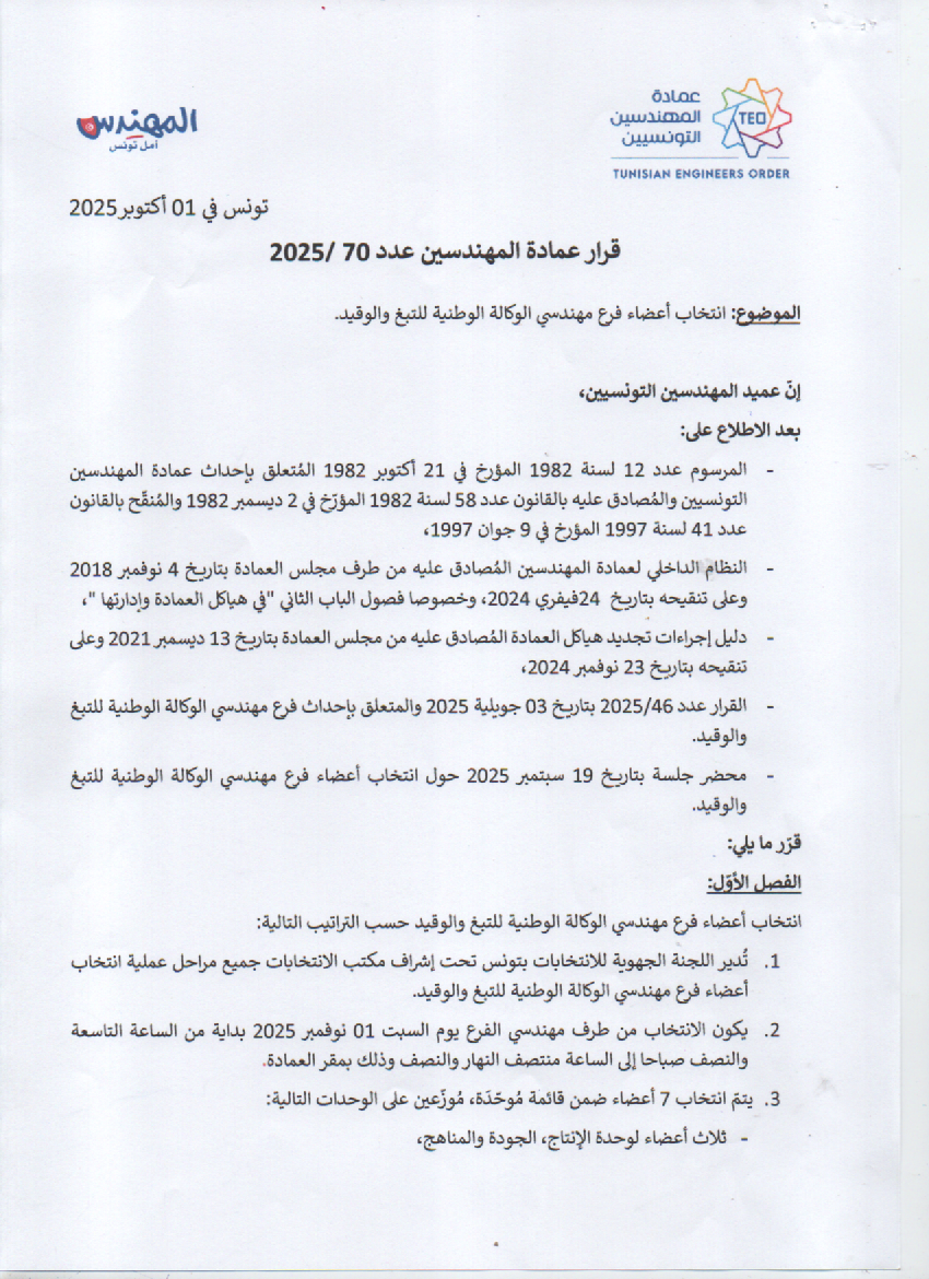 تفعيلاً للقرار عدد 46 لسنة 2025 المؤرخ في 03 جويلية 2025، والمتعلق بإحداث فرع مهندسي الوكالة الوطنية للتبغ والوقيد، تجدون في ما يلي القرار عدد 70 لسنة المتعلق2025 بإجراء انتخابات الفرع: