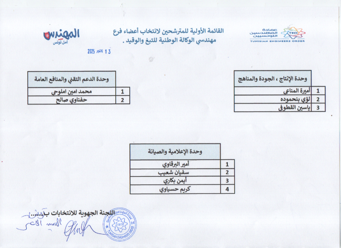 تُجرى انتخابات فرع مهندسي الوكالة الوطنية للتبغ والوقيد يوم السبت 01 نوفمبر 2025 بدار المهندس بتونس إنطلاقا من الساعة التاسعة والنصف صباحًا(09:30 إلى حدود الساعة منتصف النهار (12:00) وفي مايلي القائمة الأولية للمترشحين: