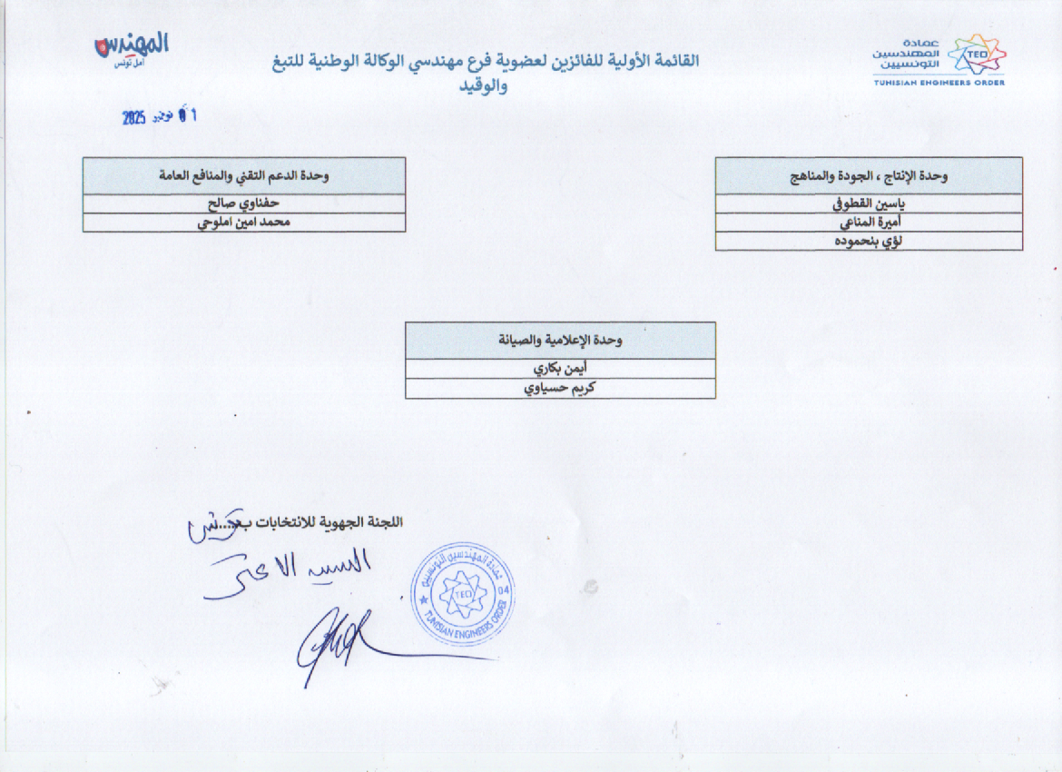 تحت إشراف اللجنة الجهوية للإنتخابات بتونس، اُجريت اليوم السبت 01 نوفمبر 2025 بدار المهندس بتونس، انتخابات فرع مهندسي الوكالة الوطنية للتبغ والوقيد وفي مايلي القائمة الأولية للفائزين: