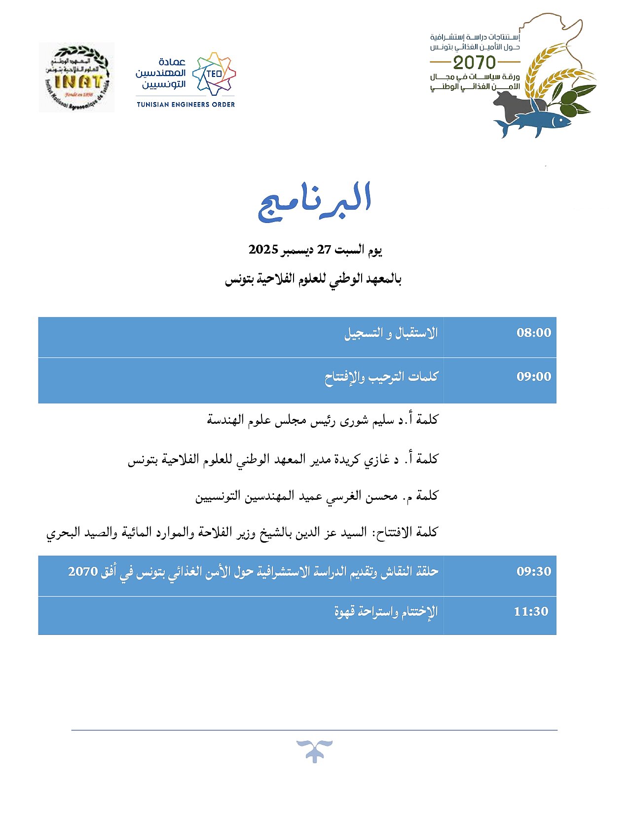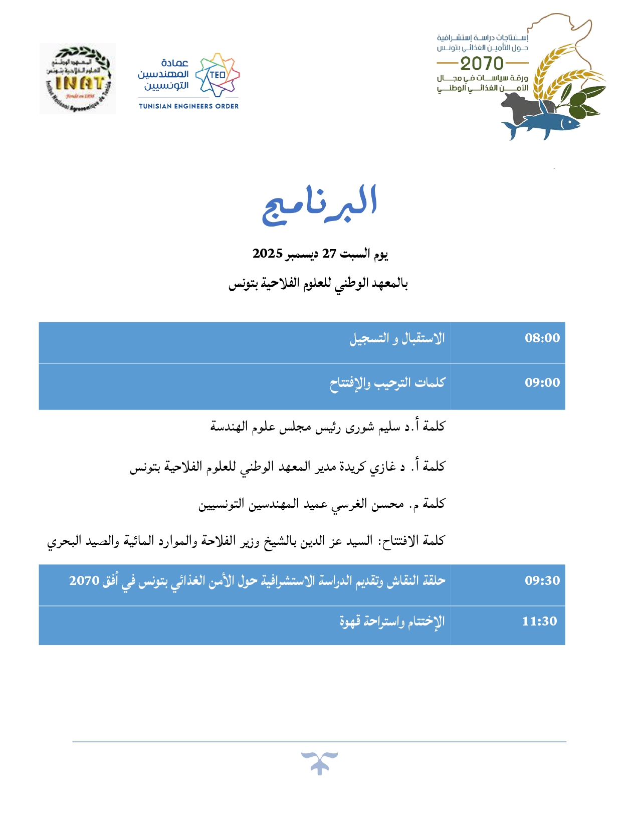 برنامج ندوة وطنية حول الأمن الغذائي في تونس أفق 2070: إستنتاجات دراسة إستشرافية وورقة سياسات وطنية