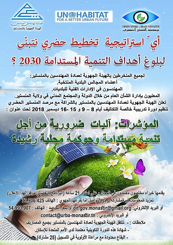 تنظم الهيئة الجهوية لعمادة المهندسين التونسيين بالمنستير بالشراكة مع مرصد المنستير الحضري دورة تكوينية خالصۃ التكاليف بعنوان ” المؤشرات : اليات ضرورية من أجل تنمية مستدامة و حوكمة محلية رشيدة ” وذلك ايام 8 و 9 و15 و16 ديسمبر 2018 تفاصيل و برنامج الدورة تجدونها على الرابط التالي:https://urlz.fr/8jiz