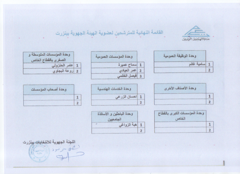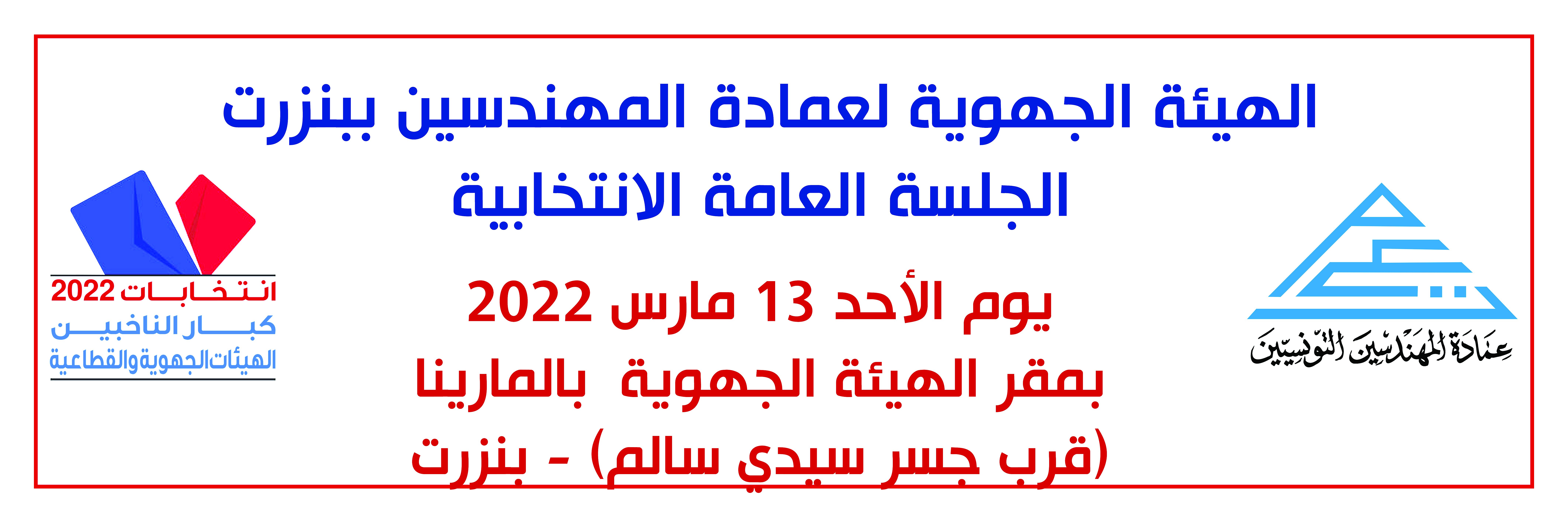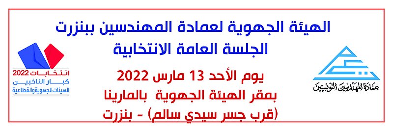 تنعقد الجلسة العامة الإنتخابية للهيئة الجهوية لعمادة المهندسين التونسيين ببنزرت يوم الأحد 13 مارس 2022 بمقر الهيئة الجهوية وفي مايلي القائمة النهائية للمترشحين لعضوية الهيئة