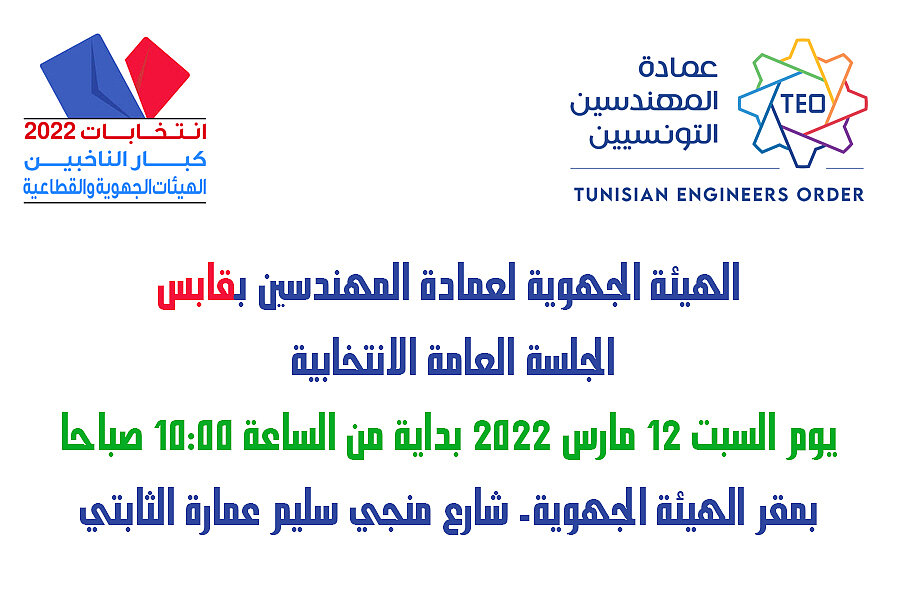 تدعو عمادة المهندسين التونسيين كافة مهندسات ومهندسي ولاية #قابس إلى الإقبال بكثافة على انتخابات تجديد تركيبة الهيئة الجهوية يوم السبت 12 مارس 2022 بمقر الهيئة شارع المنجي سليم عمارة الثابتي