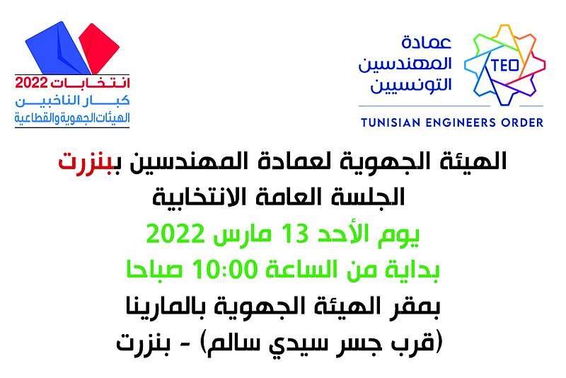 تدعو عمادة المهندسين التونسيين كافة مهندسات ومهندسي ولاية #ببنزرت إلى الإقبال بكثافة على انتخابات تجديد تركيبة الهيئة الجهوية يوم الأحد 13 مارس 2022 بمقر الهيئة الجهوية بمارينا (قرب جسر سيدي سالم) بنزرت