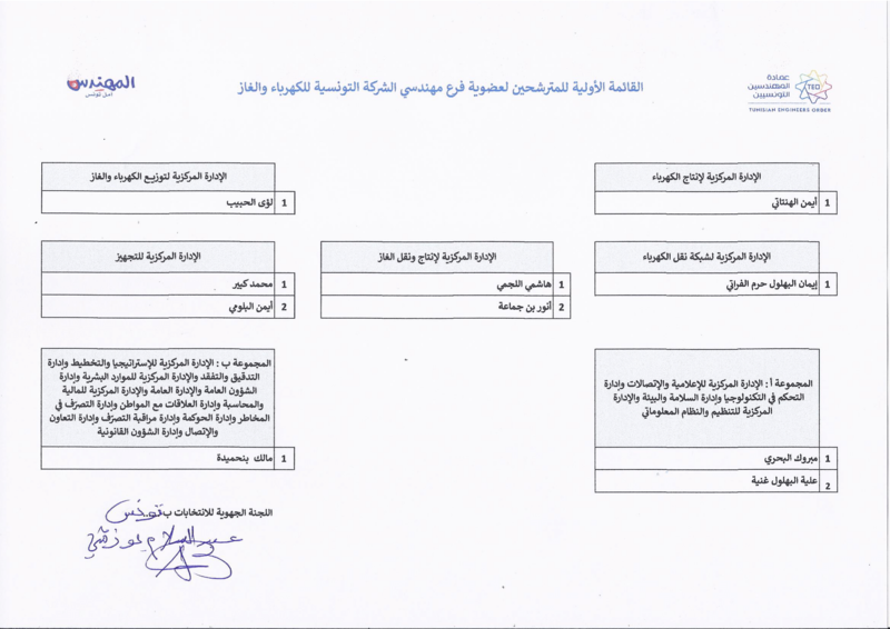 القائمة الأولية للمترشحين لانتخابات فرع مهندسي الشركة التونسية للكهرباء والغاز