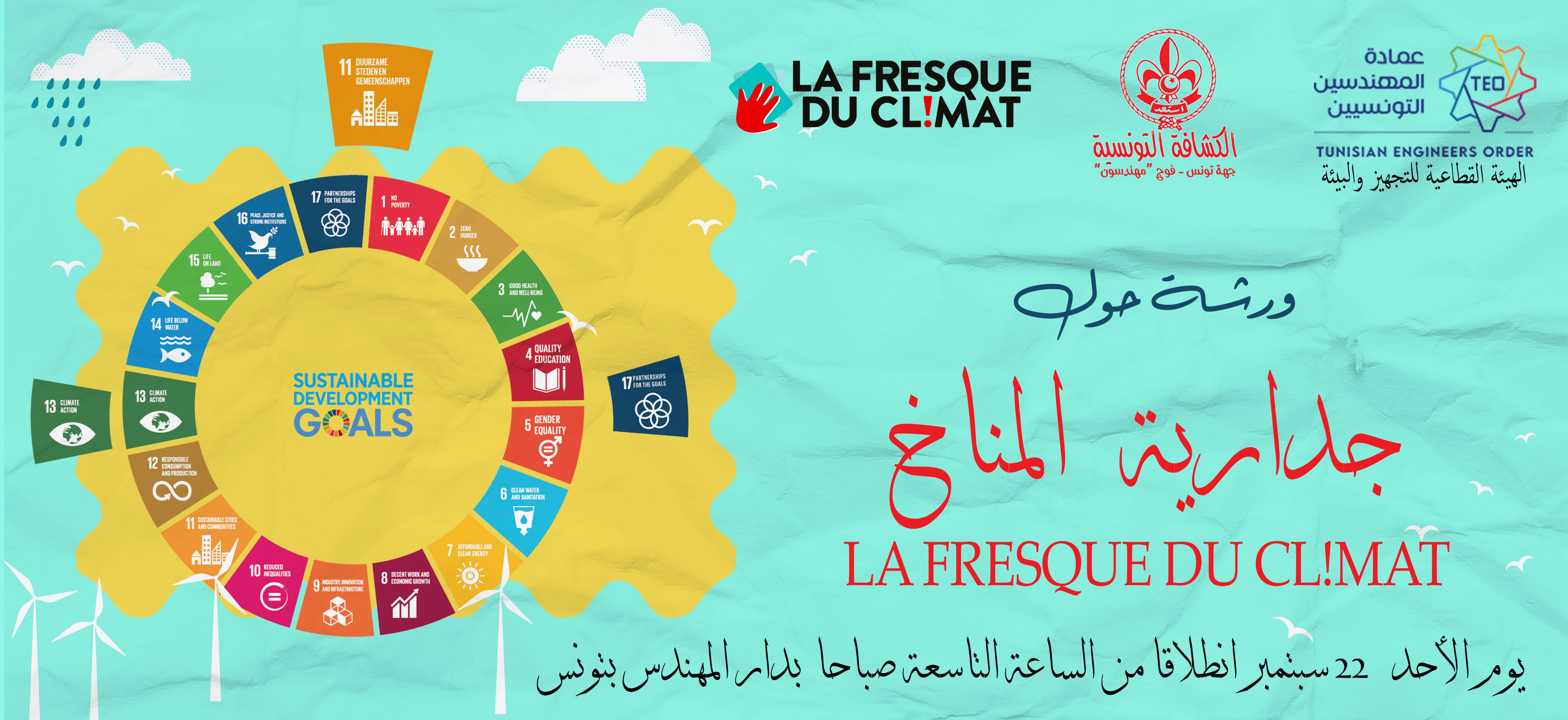 تبعًا لتأسيس الفوج الكشفي "مهندسون" تحت إشراف الهيئة القطاعية للتجهيز والبيئة بعمادة المهندسين التونسيين، تنتظم يوم الأحد 22 سبتمبر 2024 بدار المهندس بتونس على الساعة التاسعة صباحًا ورشة بعنوان جدارية المناخ "LA FRESQUE DU CL!MAT" وذلك تحت اشراف المنشطتين في مجال المناخ نهلة وسنية العوني.