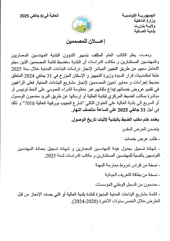 تدعو بلدية العالية المهندسين المستشارين ومكاتب الدراسات إلى تقديم عروض خدماتهم وذلك في أجل أقصاه يوم 31 جانفي 2025.