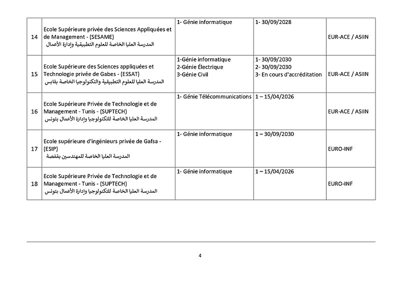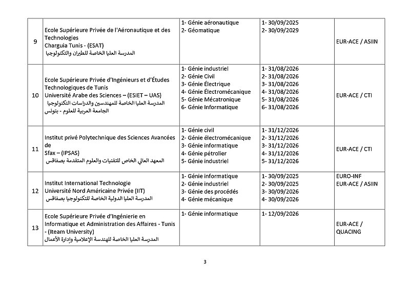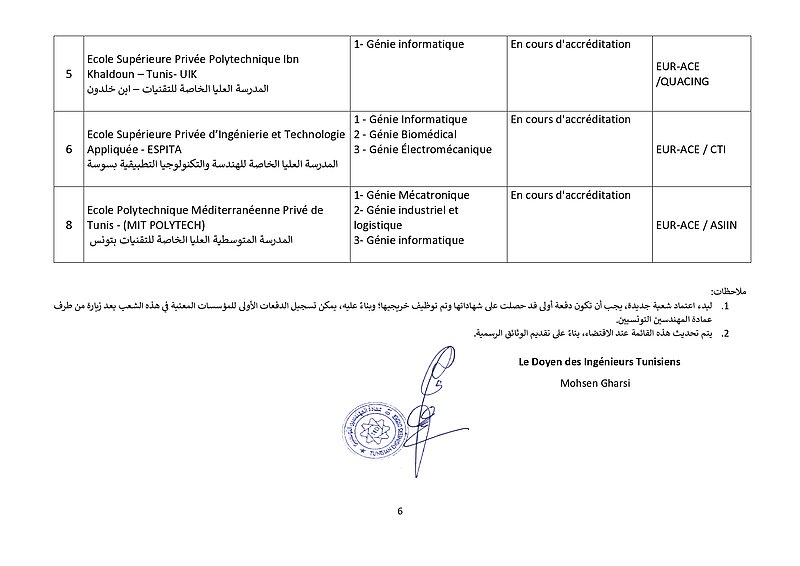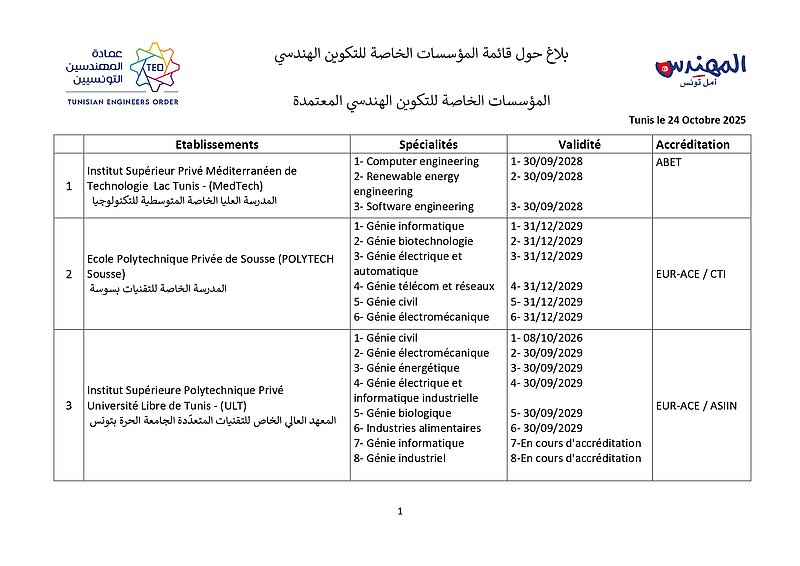 وتطبيقًا لقرارها الصادر بتاريخ 10 جويلية 2018 والذي دعت فيه كافة مؤسسات التكوين الهندسي بالبلاد التونسية إلى ضرورة القيام بإجراءات إعتماد التكوين الهندسي من طرف هيئات دولية مختصة وهو ماذكرت به في بلاغات رسمية في مفتتح كل سنة جامعية، وأصدرت على إثره قائمة في المؤسسات الخاصة المعتمدة والتي في طور الإعتماد، وذلك بعد سلسلة من الزيارات الميدانية للمؤسسات الخاصة للتكوين الهندسي نفذّها ثُلّة من المهندسين الخبراء والأساتذة الجامعيين، وبعد المتابعة مع هيئات الإعتماد الدولية ولتحيين المعطيات تمت مراسلة المؤسسات الخاصة للتكوين الهندسي التي بصدد تجديد شهادة إعتمادها لموافاتنا بما يُفيد تحصلها على شهائد الإعتماد لسنة 2025 وما بعدها والمؤسسات الخاصة للتكوين الهندسي التي لاتزال في طور الإعتماد لتزويدنا بمدى تقدم ملفها ومختلف المؤيدات اللاّزمة في الغرض. وبعد جمع الملفات المقدمة والتثبت فيها من خلال مواقع هيئات الإعتماد الدولية نمدُّكم بقائمة المؤسسات الخاصة للتكوين الهندسي التي سيتم تسجيل خرّيجيها بجدول عمادة المهندسين التونسيين وعددها 24 مؤسسة حسب الجدول المصاحب والذي سيتم تحيينه كُلّما إستوجب الأمر.