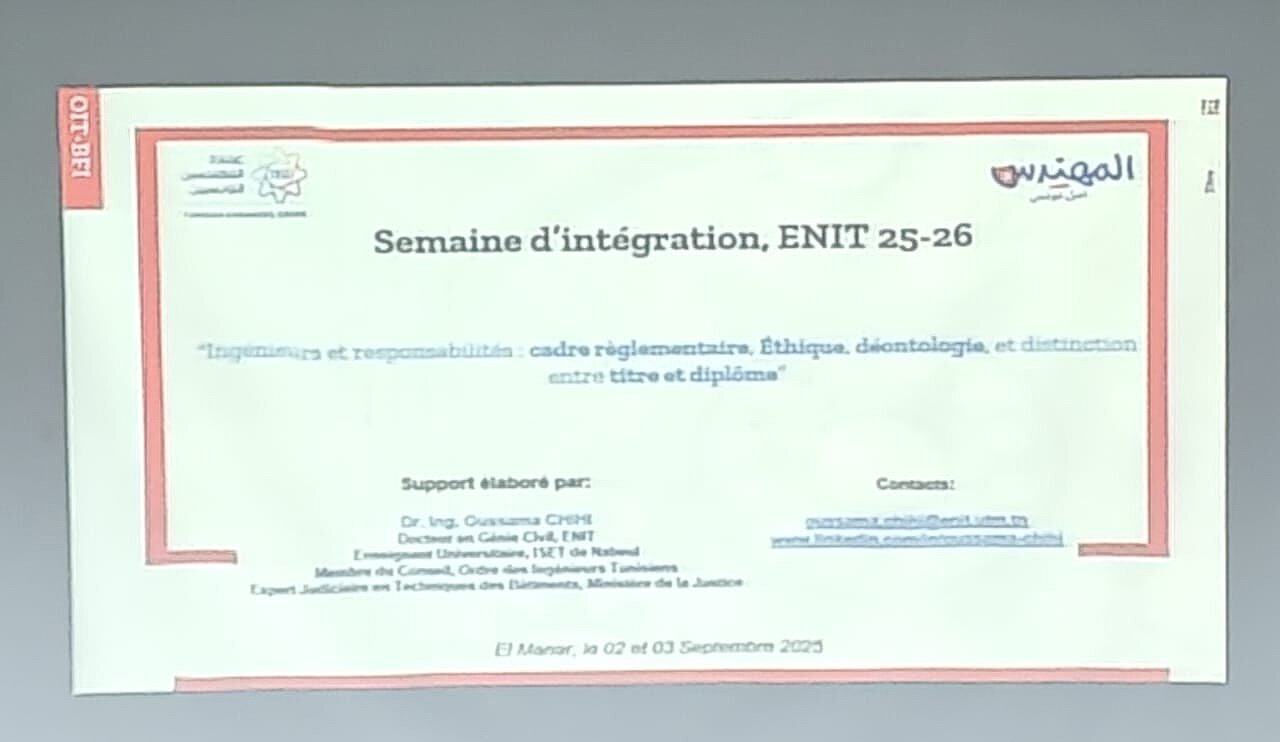 Dans le cadre de la rentrée universitaire ing Oussama Chihi, membre du Conseil de l’Ordre des Ingénieurs Tunisiens, a participé activement à la semaine d’intégration organisée par l’École Nationale d’Ingénieurs de Tunis (ENIT), les 2 et 3 septembre 2025.