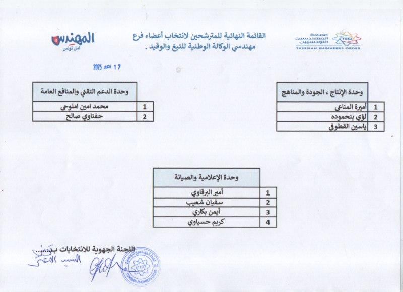 تُجرى انتخابات فرع مهندسي الوكالة الوطنية للتبغ والوقيد يوم السبت 01 نوفمبر 2025 بدار المهندس بتونس إنطلاقا من الساعة التاسعة والنصف صباحًا(09:30 إلى حدود الساعة منتصف النهار (12:00) وفي مايلي القائمة النهائية للمترشحين: