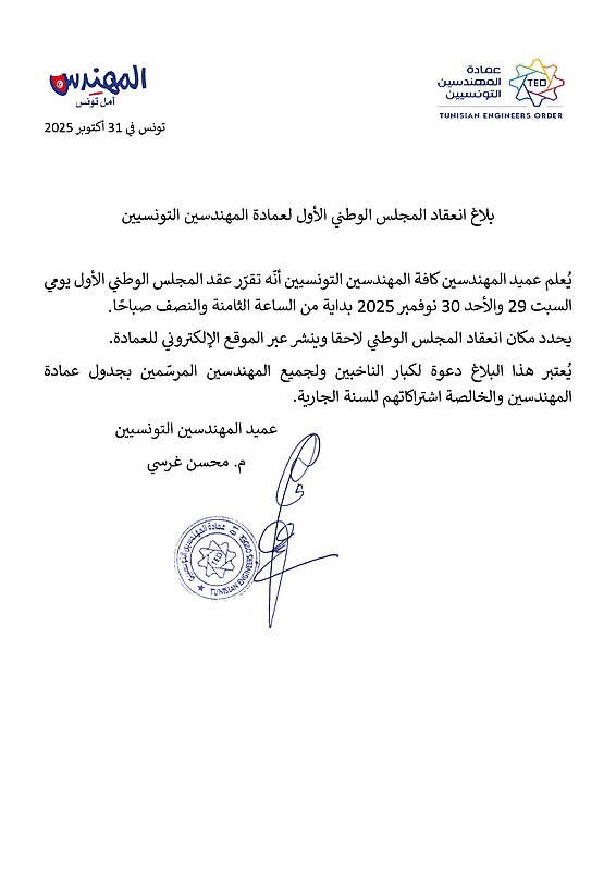 يُعلم عميد المهندسين كافة المهندسين التونسيين أنّه تقرّر عقد المجلس الوطني الأول يومي السبت 29 والأحد 30 نوفمبر 2025 بداية من الساعة الثامنة والنصف صباحًا.