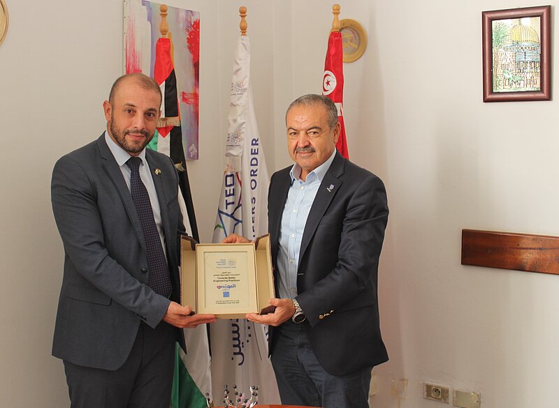 استقبل المهندس محسن الغرسي عميد المهندسين التونسيين، يوم الثلاثاء 11 نوفمبر 2025 بـ"دار المهندس" بتونس، المهندس طارق عتماوي رئيس نقابة المهندسين الفلسطينية.