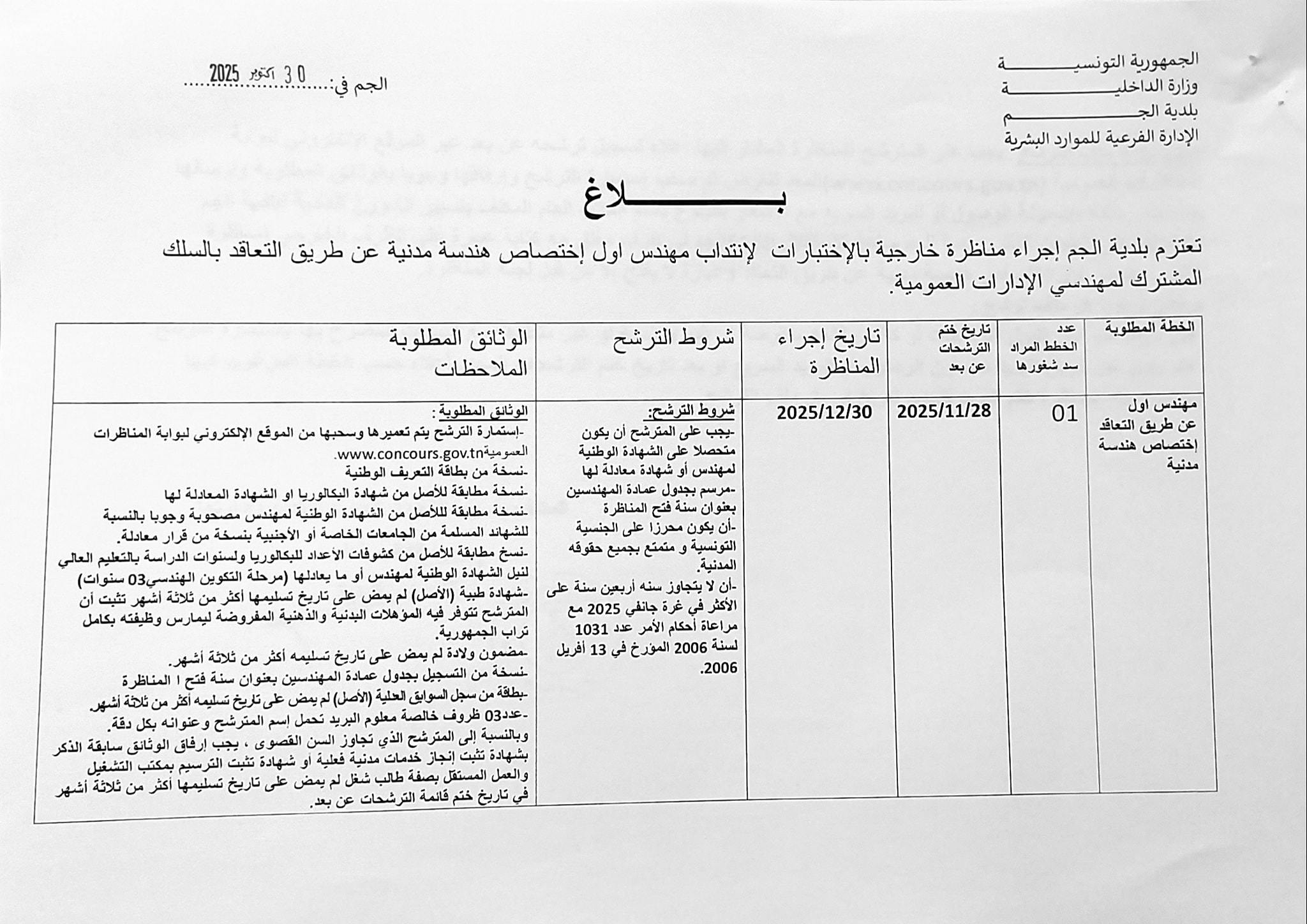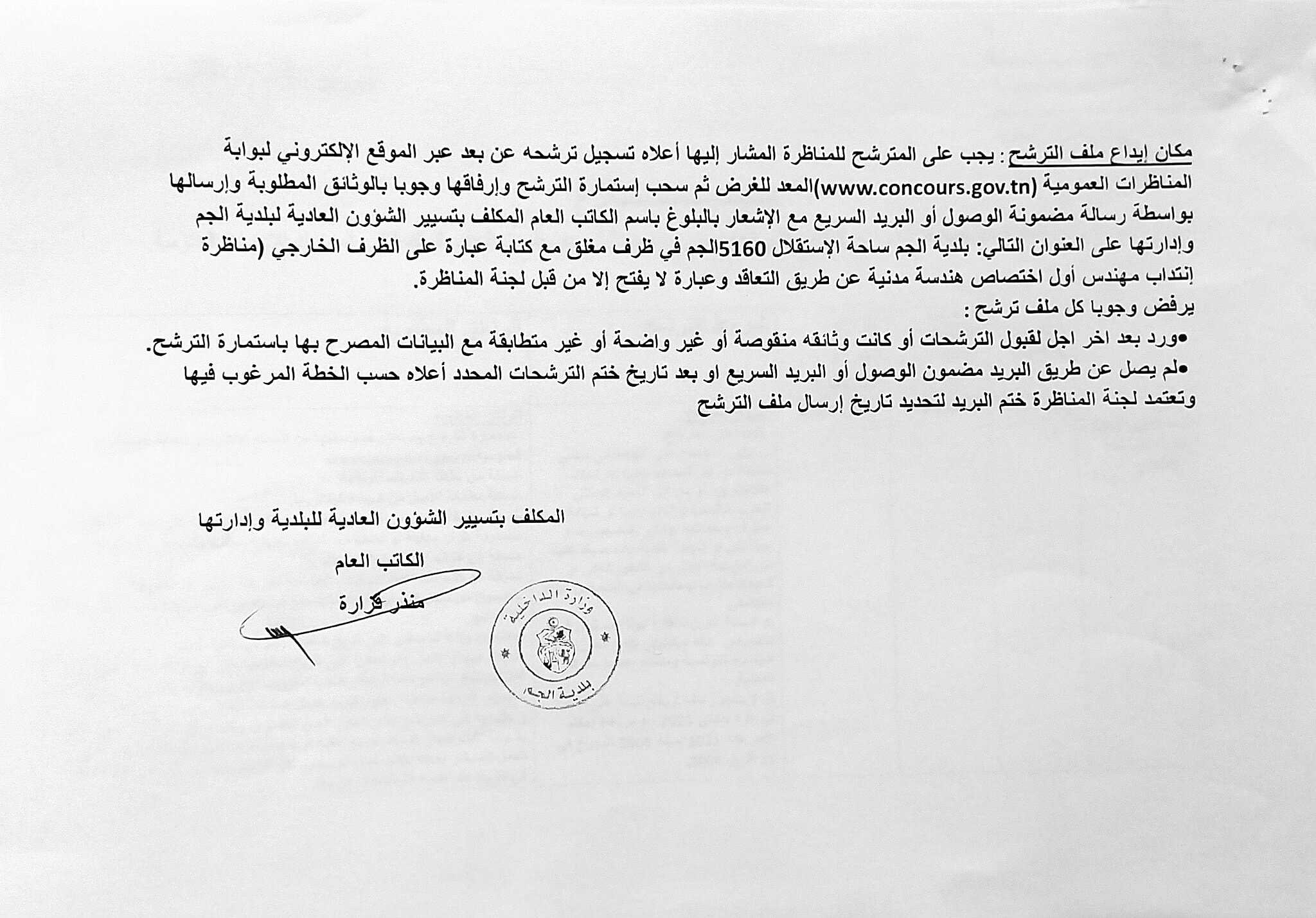مناظرة بلدية الجم لانتداب مهندس إختصاص هندسة مدنية