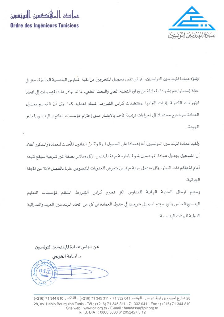 وتنوّه عمادة المهندسين التونسيين، أنها لن تقبل تسجيل المتخرجين من بقية المدارس الهندسية الخاصّة، حتى في حالة إستظهارهم بشهادة المعادلة من وزارة التعليم العالي والبحث العلمي، ما لم تبادر هذه المؤسسات إلى اتخاذ الإجراءات الكفيلة بإثبات التزامها بمقتضيات كراس الشروط المنظم لعملها. كما تبيّن أنّ الترسيم بجدول العمادة سيخضع مستقبلا إلى إجراءات ترتيبية تأخذ بالاعتبار مدى إحترام مؤسسات التكوين الهندسي لمعايير الجودة.