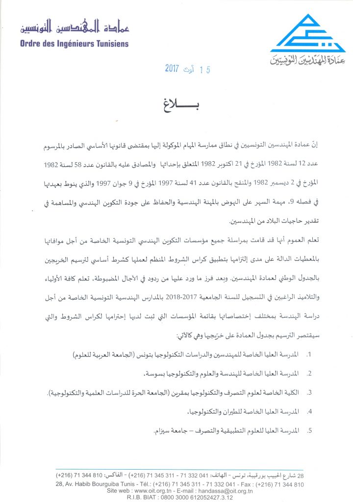 تعلم العموم أنها قد قامت بمراسلة جميع مؤسسات التكوين الهندسي التونسية الخاصة من أجل موافاتها بالمعطيات الدالة على مدى إلتزامها بتطبيق كراس الشروط المنظم لعملها كشرط أساسي لترسيم الخريجين بالجدول الوطني لعمادة المهندسين. وبعد فرز ما ورد عليها من ردود في الآجال المضبوطة، تعلم كافة الأولياء والتلاميذ الراغبين في التسجيل للسنة الجامعية 2017-2018 بالمدارس الهندسية التونسية الخاصة من أجل دراسة الهندسة بمختلف إختصاصاتها بقائمة المؤسسات التي ثبت لديها إحترامها لكراس الشروط والتي سيقتصر الترسيم بجدول العمادة على خرّيجيها وهي كالآتي: