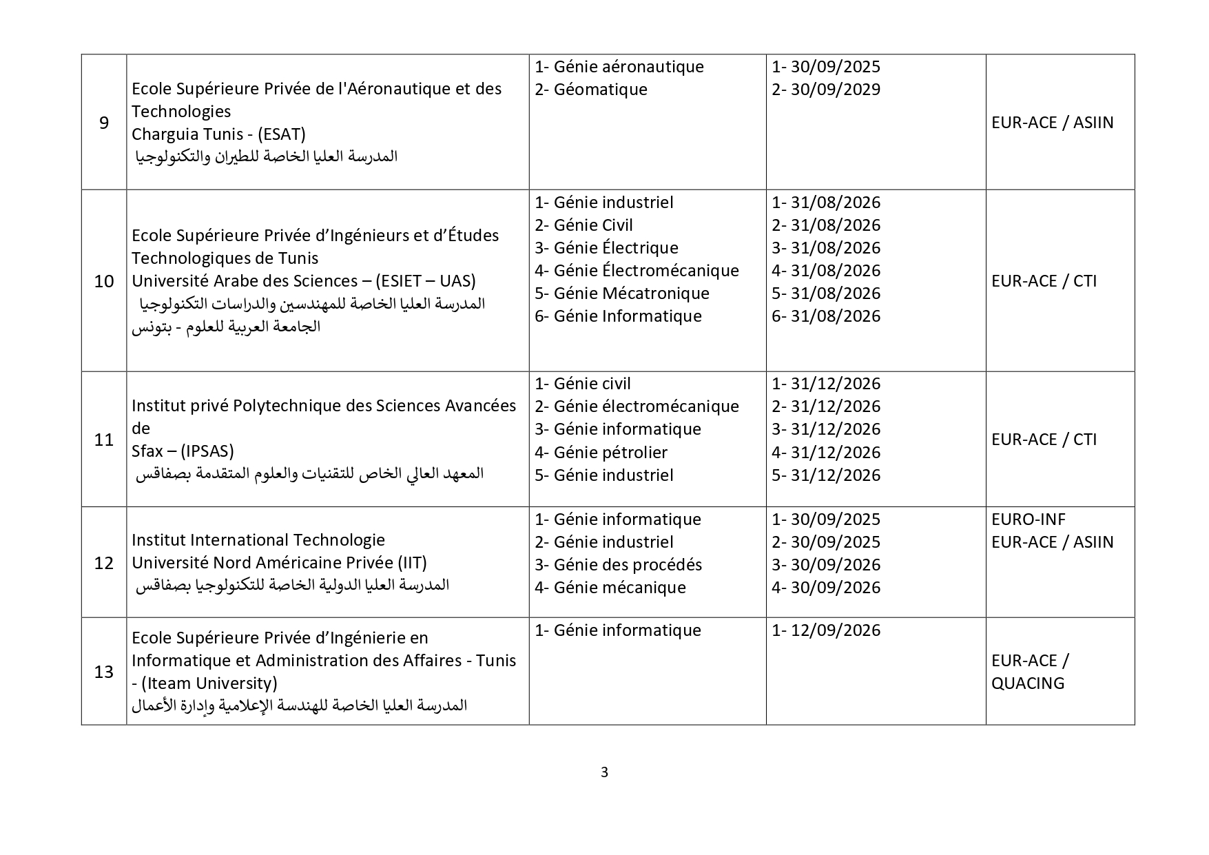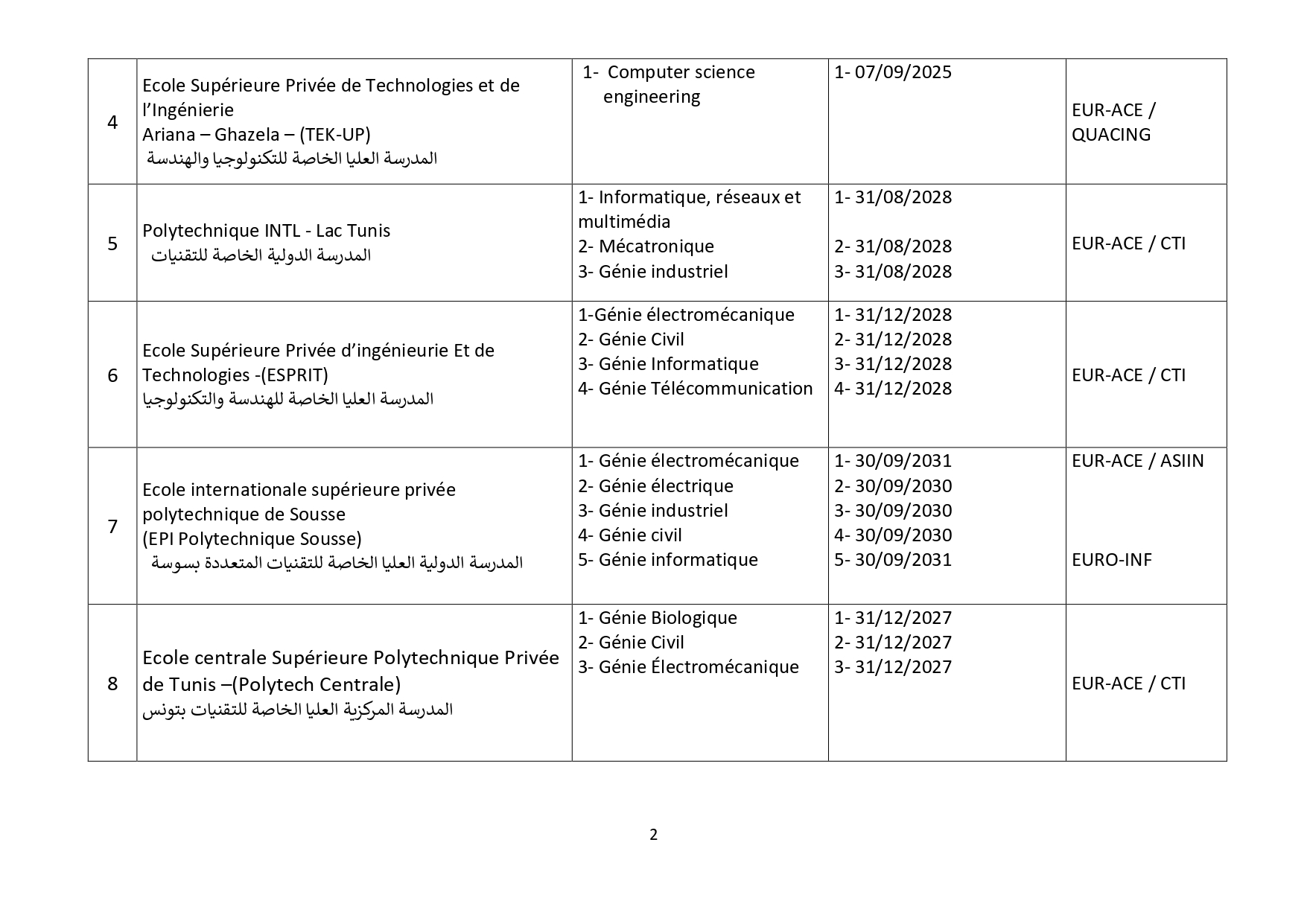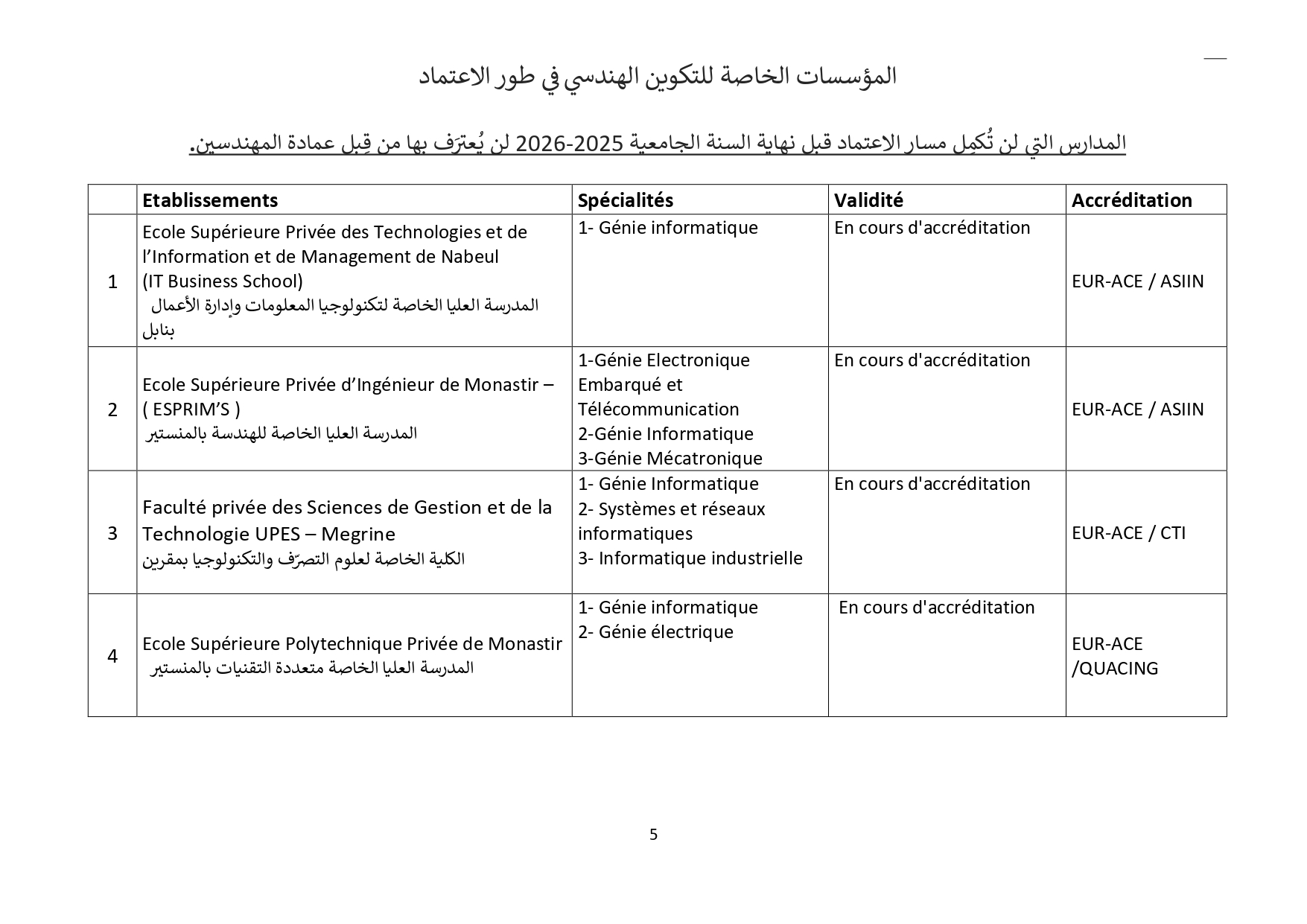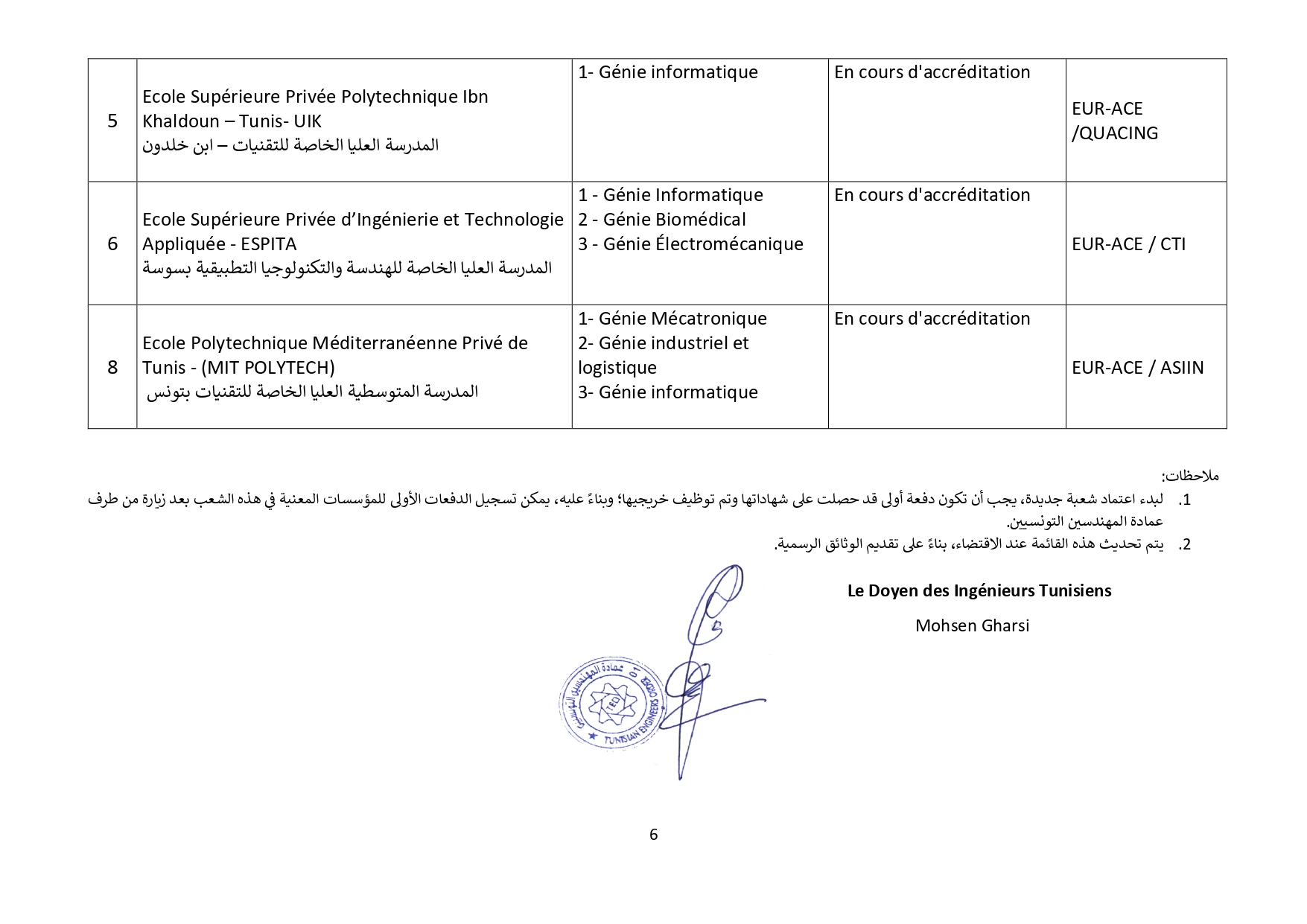 وتطبيقًا لقرارها الصادر بتاريخ 10 جويلية 2018 والذي دعت فيه كافة مؤسسات التكوين الهندسي بالبلاد التونسية إلى ضرورة القيام بإجراءات إعتماد التكوين الهندسي من طرف هيئات دولية مختصة وهو ماذكرت به في بلاغات رسمية في مفتتح كل سنة جامعية، وأصدرت على إثره قائمة في المؤسسات الخاصة المعتمدة والتي في طور الإعتماد، وذلك بعد سلسلة من الزيارات الميدانية للمؤسسات الخاصة للتكوين الهندسي نفذّها ثُلّة من المهندسين الخبراء والأساتذة الجامعيين، وبعد المتابعة مع هيئات الإعتماد الدولية ولتحيين المعطيات تمت مراسلة المؤسسات الخاصة للتكوين الهندسي التي بصدد تجديد شهادة إعتمادها لموافاتنا بما يُفيد تحصلها على شهائد الإعتماد لسنة 2025 وما بعدها والمؤسسات الخاصة للتكوين الهندسي التي لاتزال في طور الإعتماد لتزويدنا بمدى تقدم ملفها ومختلف المؤيدات اللاّزمة في الغرض. وبعد جمع الملفات المقدمة والتثبت فيها من خلال مواقع هيئات الإعتماد الدولية نمدُّكم بقائمة المؤسسات الخاصة للتكوين الهندسي التي سيتم تسجيل خرّيجيها بجدول عمادة المهندسين التونسيين وعددها 24 مؤسسة حسب الجدول المصاحب والذي سيتم تحيينه كُلّما إستوجب الأمر.